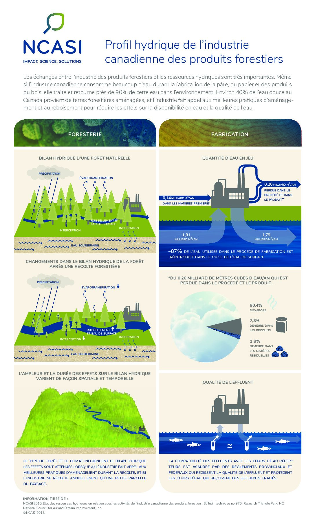 The forest products industry has important interactions with water resources. This NCASI infographic illustrates that, while the Canadian industry uses a significant amount of water during the manufacture of pulp, paper and wood products, it treats and returns nearly 90% of that water to the environment. About 40% of the country’s fresh water originates from managed forest land, and the industry uses best management practices and forest regrowth to minimize effects on water availability and water quality.